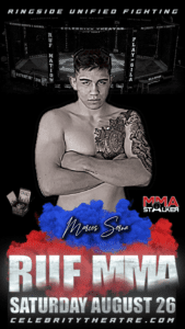 Marcos Serna is a professional MMA fighter in the Welterweight division. Standing at 5’11” (180cm), Serna fights out of Arizona. His most recent bout with Kyle Neal at RUF 51: Year End Finale, which was scheduled for December 10, 2022, was unfortunately cancelled. Further details about his record, age, and date of birth are not available.